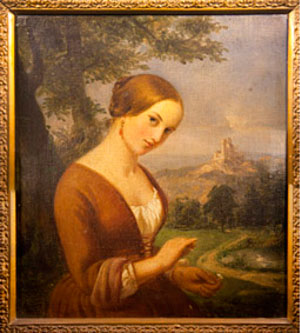 148. Porträt einer jungen Frau, Verlobungsbild? Im Hintergrund eine Burg