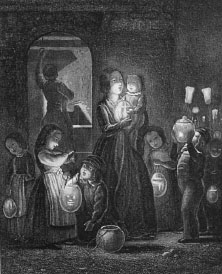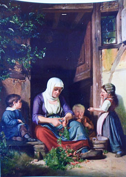 150. Mutter mit drei kleinen Kindern beim Putzen der Möhren auf der Schwelle eines Fachwerkhauses sitzend