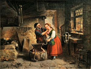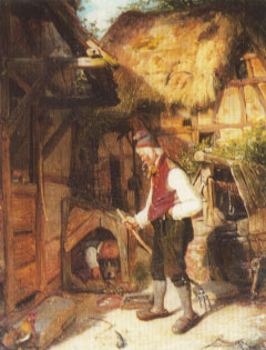 Aus südafrikanischem Privatbesitz stammt dieses Gemälde Peter Schwingens. Es handelt sich um eine weitere Version des Bildes „In der Schmiede“, allerdings eine kleinformatige Version, ca. 28cm x 32,5cm, signiert P. Schwingen